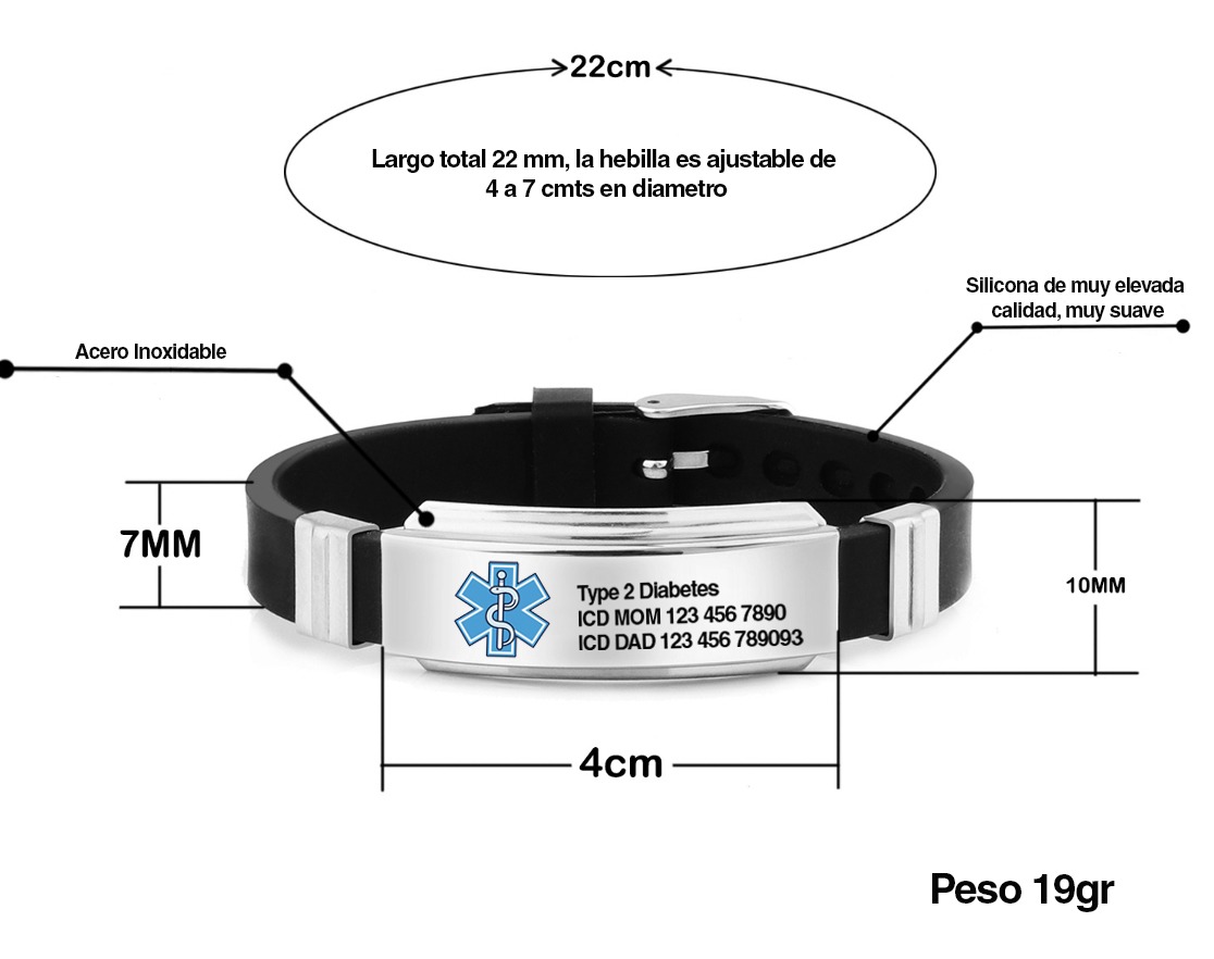 Brazalete de 22 cmts de diametro, en Silicona muy suave, de elevada calidad, con hebilla ajustable al frente en Acero Inoxidable, de 4 a 7 cmts de diametro. Marcacion en laser con los datos medicos de cada persona.