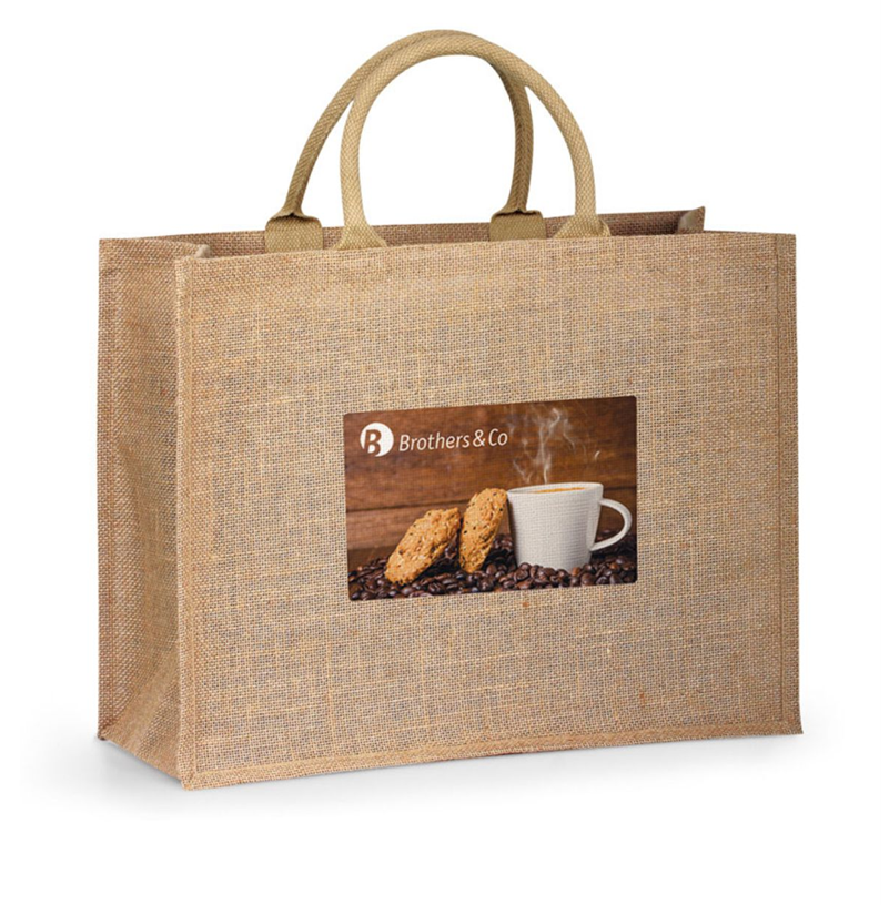 Bolso elaborado en Yute, con bolsillo al frente para colocar el logo, bolsillo interno
