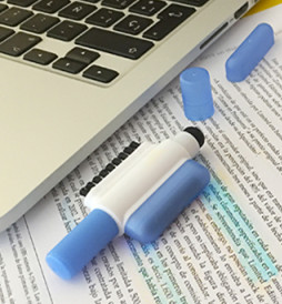 Resaltador Cleaner, no se seca. De 8 x 1.6 x 3.8 cmts. Con paño en microfibra para limpiar pantallas y escoba de limpieza para teclados.