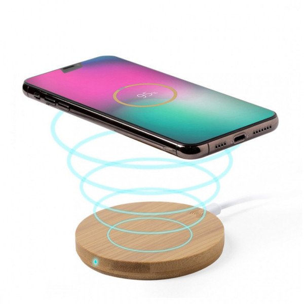 Cargador inalámbrico elaborado en bambú. Carga de 10 W. Input:9V-2A / Output: 5V-2A. Incluye cable USB.