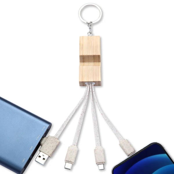Set de carga tipo llavero con cable tipo C, Micro USB y Lighting. 5V DC 2.4A. Soporte para teléfono móvil. Fabricado en resistente bambú.